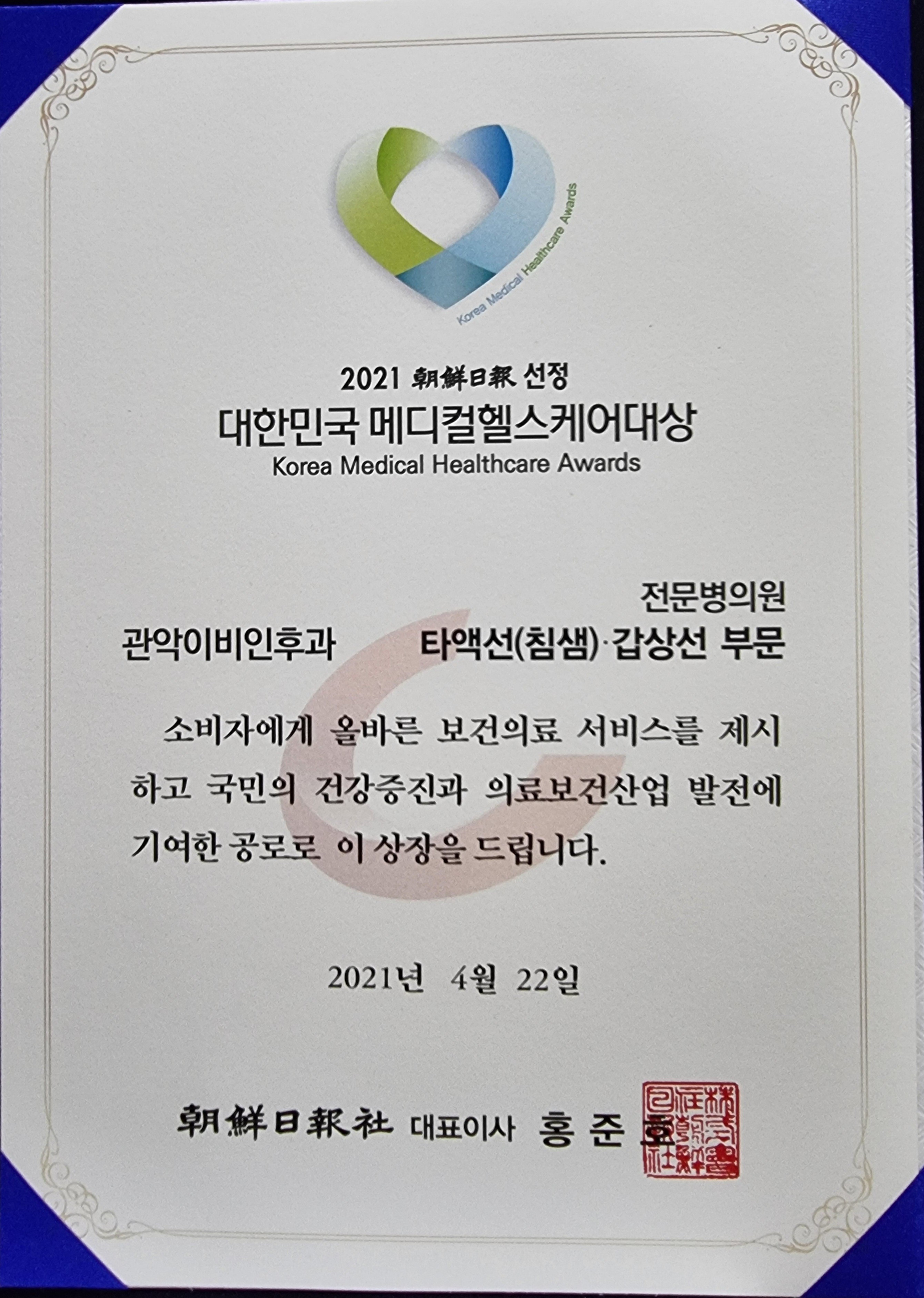 ´ëÇѹα¹ÇコÄÉ¾î ´ë»ó¿¡ °ü¾ÇÀ̺ñÀÎÈİú°¡ °³¿ø°¡¿¡¼ À¯ÀÏÇÏ°Ô ´ë»ó(Ÿ¾×¼±:ħ»ù, °©»ó¼± ºÎ¹®)À» ¼ö»óÇÏ°Ô µÇ¾ú½À´Ï´Ù.